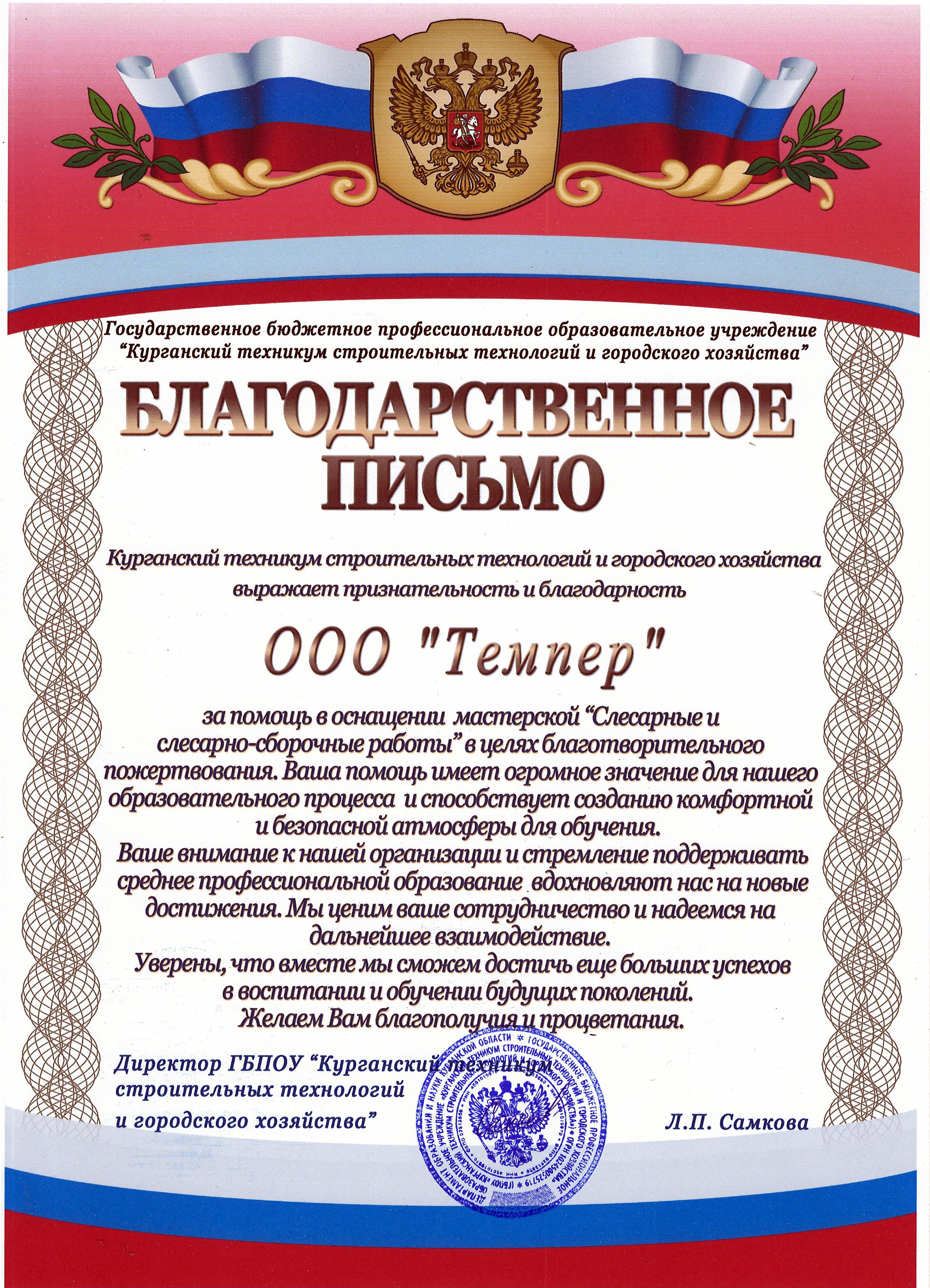 "ТЕМПЕР" получил благодарственное письмо от ГБПОУ "Курганский техникум строительных технологий и городского хозяйства" за помощь в оснащении современной мастерской "Слесарные и слесарно-сборочные работы".
