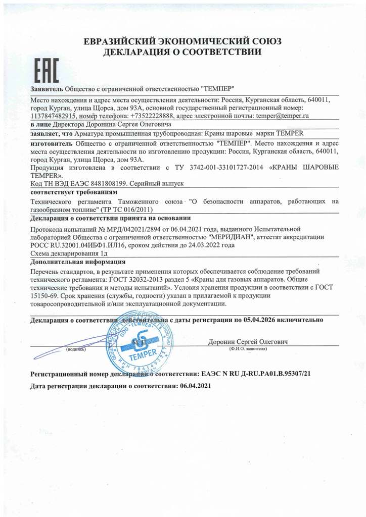 Получена декларация соответствия продукции завода ТЕМПЕР требованиям технического регламента Таможенного союза "О безопасности аппаратов, работающих на газообразном топливе" (ТР ТС 016/2011). Срок действия: по 05.04.2026 г. включительно.