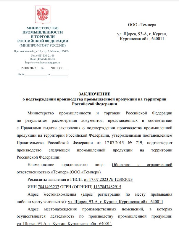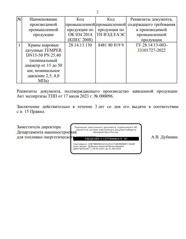заключение Минпромторга РФ о производстве латунных кранов TEMPER в России